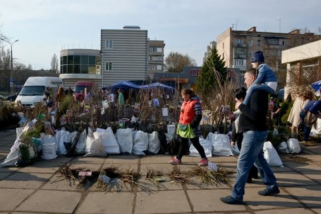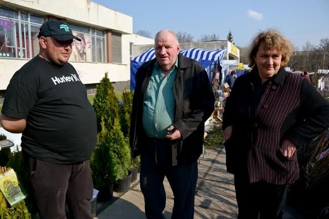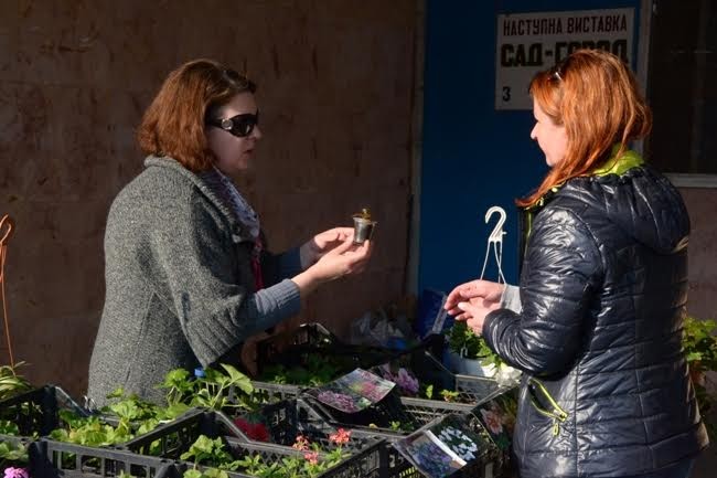 Рядом с Раду, цветущими кустарниками роз, пионов, сирени, а также плодово-ягодными кустарниками, торгует Анна. Она приехала из Киевской области и привезла продавать цветы и кусты, которые выращивают ее братья Рудые. Возле ее палатки тоже многолюдно. Особым спросом пользуются древовидные пионы белого, розового, малинового, красного цвета. Анна рассказала, что чем старше пионовый куст, тем больше на нем распускается цветков. Цветки бывают простые, махровые, и даже двухцветные. Цветут они до 3-х недель, куст стоит 100 гривен. Сирень стоит от 40 до 50 гривен, роза – 25-30, веточка малины -15, куст черной или красной смородины, крыжовника - от 20 до 30 гривен. Есть в продаже даже кусты голубики (60-70 грн.).