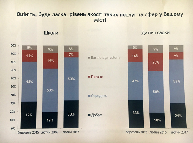 – Очень хороший результат показали школы Чернигова: по мнению жителей города в разделе «хорошо» за минувший год оценка прибавила +14%, а в разделе «плохо» – уменьшилась на – 12%. Положительная динамика наблюдается и в оценке предоставления услуг дошкольными заведениями: в разделе «хорошо» +11%, в разделе «плохо» – 14%.