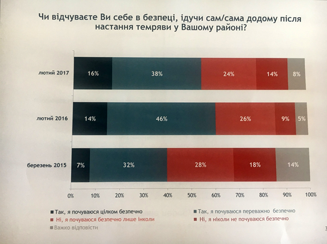 – Я должен отметить снижение мнения «в целом безопасно» и «преимущественно безопасно». В 2016 году этот показатель составлял суммарно 60%, а в 2017 снизился до 54%. И, в то же время 38% опрошенных в 2017 году не чувствуют себя в безопасности. Этот же показатель в 2016 году был на уровне 35%. Я бы сказал, что это очень важные моменты, поскольку вопросам безопасности значительное внимание уделяет вся мировая общественность. Я думаю, что этот социальный опрос довольно авторитетен и будет на столе и у Президента, и у Премьер-министра Украины. Премьер-министр присутствовал на презентации. То есть это – выводы, которые за свои деньги, для понимания изменения ситуации в нашей стране делают иностранцы. Учитывая, что вопрос безопасности очень важен сегодня, полиции необходимо взять на вооружение результаты исследования и работать на улучшение динамики в этом вопросе, – считает городской голова.
