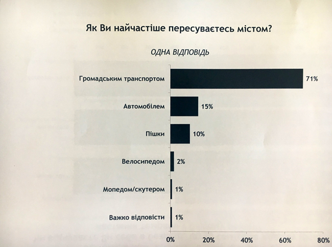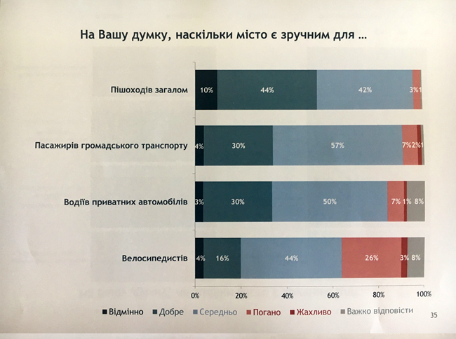 – Поскольку более 70% респондентов передвигается по городу в общественном транспорте, а на собственных авто только 15%, качество услуг общественного транспорта остается очень важным для жителей Чернигова. На следующей диаграмме мы видим, что наш город наиболее удобен для передвижения пешеходов и меньше всего приспособлен для передвижения на велосипеде.