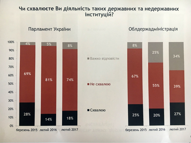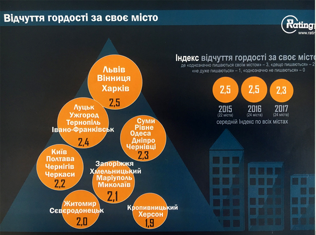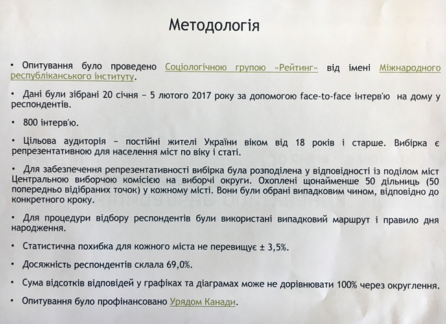 Экспертами информационно-аналитического центра «RATING Pro» проанализировали результаты опросов социологической группы «Рейтинг», проведенных по заказу Международного Республиканского Института при поддержке Правительства Канады в марте 2015 года (17,600 респондентов), и в феврале 2016 (19,200 респондентов) и в феврале 2017 (19,200 респондентов) среди жителей всех областных центров Украина, а также Киева, Мариуполя и Северодонецка.