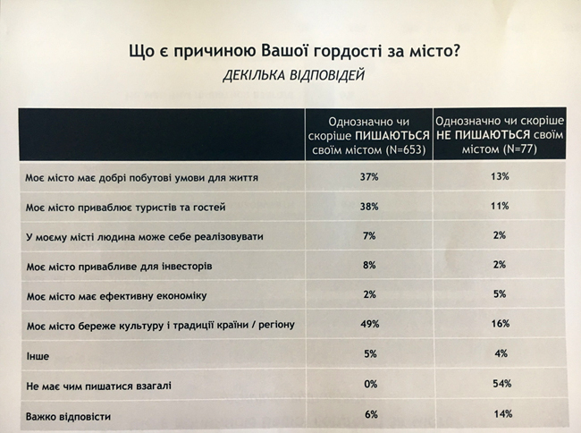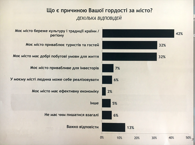 – Гордость жителей Чернигова за свой город остаётся на среднем уровне по стране. На следующем слайде мы видим причины этой гордости. На первом месте у нас то, что город бережет культуру и традиции Украины. Далее – город привлекает туристов и в нем хорошие условия для жизни.