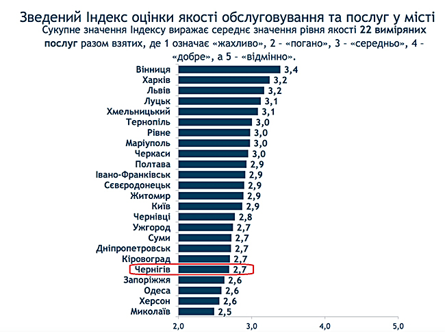 – На сегодняшний день Чернигов находится на 13 месте по показателям удовлетворенности качеством 22 сфер и услуг по Украине. Если посмотреть на диаграмму, то видим, что Львов, Полтава, Черкассы имеют одинаковые с нами показатели. При этом именно Чернигов показал наилучшие темпы роста показателей, в сравнении с предыдущими периодами.