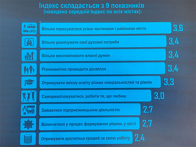 – По потенциалу возможностей Чернигов находится посредине рейтинга областных центров Украины. Далее мы видим показатели, по которым оценивается индекс удовлетворенности жизнью в городе.
