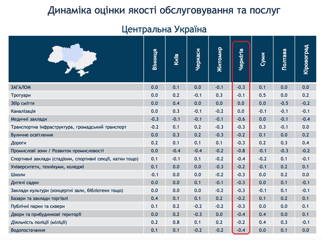 – Если посмотреть на динамику показателей качества обслуживания и услуг по Украине в целом, то мы видим, что у многих городов они идут и вниз, и вверх. А у Чернигова – показатели или остались на предыдущем уровне, или улучшились. В частности, в гуманитарной сфере и в сфере инфраструктуры у нас серьезный прирост по сравнению с прошлым годом.