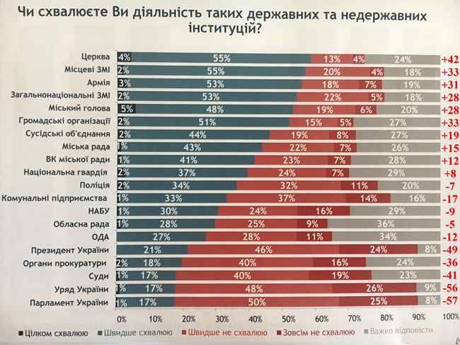 – По этому разделу просматривается позитивная динамика. И это я оцениваю, как высокую ответственность. И у президентов, и у мэров в первый год работы уровень доверия, как правило, очень высокий. И, наша задача, на второй и третий годы эти показатели не снизить, а поднять, – прокомментировал диаграмму Владислав Атрошенко. – Мне очень приятно, что уровень доверия к власти в Чернигове растет. Этот рейтинг я считаю объективным, поскольку на первой позиции мы видим Харьков. А харьковчане, действительно, очень уважают Кернеса. Там есть системная работа. И, я думаю (обращаюсь к правоохранительным органам), что такого безобразия с МАФами, с незаконным строительством, как в Чернигове, при том же самом законодательстве, там нет! Это минус нам всем. Как хотите, так это и воспринимайте.