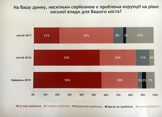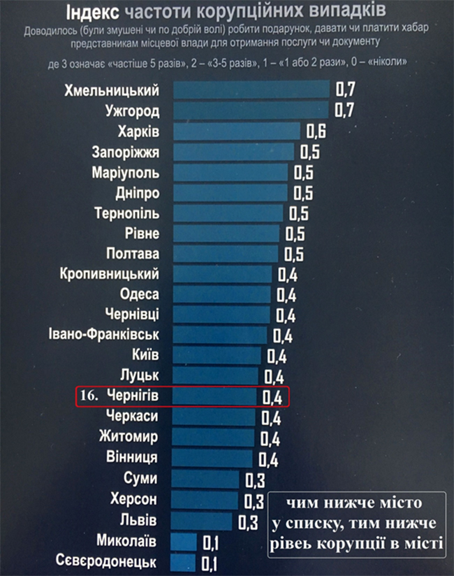 – В списке уровня коррупции Чернигов находится на 16 месте. Наибольшие коррупционные риски в Хмельницком и Ужгороде, а наименьшие – в Николаеве и Северодонецке. При этом в Чернигове проблема коррупции на уровне городской власти уменьшается. А на карте, демонстрирующей частоту случаев коррупции и пессимизм населения в отношении ее уменьшения, Чернигов находится ниже среднего уровня, что, безусловно, есть позитивным показателем.