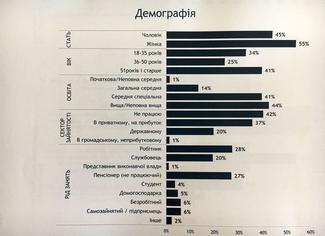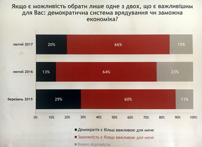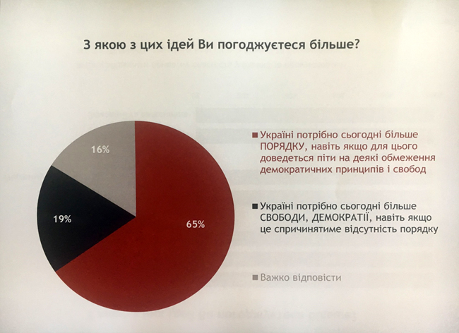– Около 65% горожан считает, что Украине необходимо больше порядка, даже в случае, если придется пойти на определенные ограничения. И только 19% уверены в том, что необходимо больше свободы и демократии.