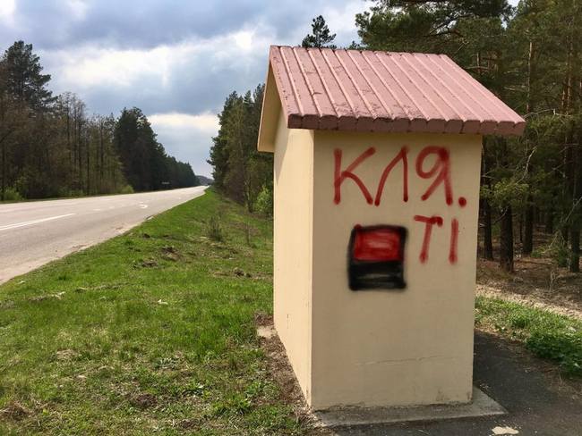 17 квітня о 19.55 в російській соцмережі «МирТесен» з’явилося дві фотографії з підписом «Без комментариев». На фото — зупинка і вбиральня на трасі. На них — написи «Ми любимо Росію» і слово «кляті» біля червоно-чорного прапора*. На зупинці значиться населений пункт Шумейкине. Під фото підпис: «Украина, Черниговская область». Посилання>>>.