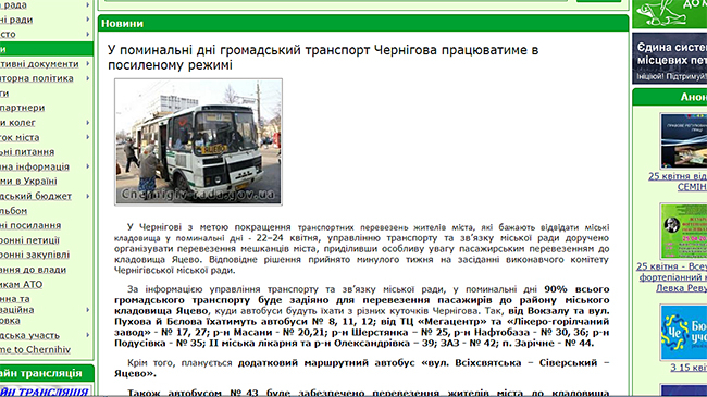 В поминальные дни 22 и 23 апреля черниговцы не увидели 90% транспорта, идущего в направлении кладбища Яцево, как обещало накануне профильное управление горсовета. По оценкам жителей города, организация перевозок и дорожного движения 22 и 23 апреля была неудовлетворительной. Кроме того, в воскресенье автомобили и общественный транспорт были заблокированы в километровых очередях на улице Шевченко. А пассажиры, несмотря на преклонный возраст, были вынуждены выходить из общественного транспорта и двигаться в сторону Яцево пешком.