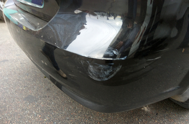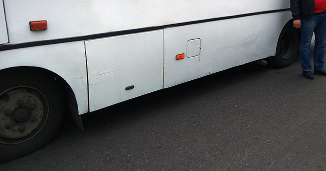 Судя по положению транспортных средств, автобус продолжил движение, в результате чего черный след от пластикового бампера AVEO остался на нескольких участках нижней части борта автобуса. В подобной ситуации, как нам кажется, достаточно было бы купить пузырек растворителя, чтобы стереть черную полоску, но водитель автобуса самостоятельно не стал принимать решение, а перезвонил владельцу маршрута.