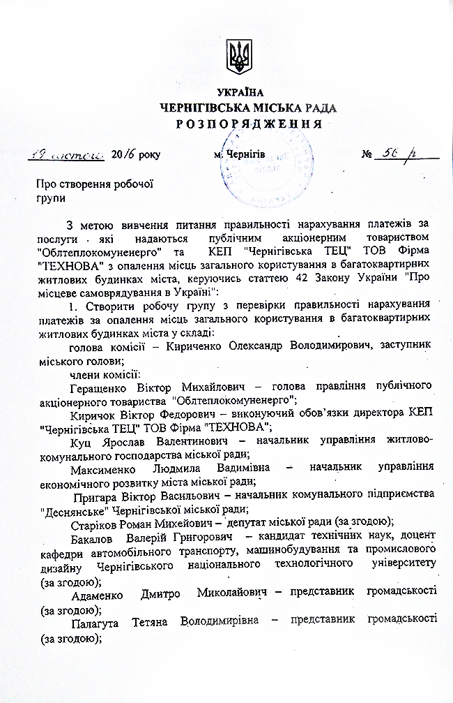 Естественно, ни в какой суд Владислав Атрошенко подавать не стал. Уже через шесть дней, 19 февраля, городской голова Чернигова Владислав Атрошенко подписал распоряжение об изучении вопроса «правильності нарахування платежів за послуги які надаються публічним акціонерним товариством "Облтеплокомуненерго" та КЕП "Чернігівська ТЕЦ" ТОВ Фірма "ТЕХНОВА" з опалення місць загального користування в багатоквартирних житлових будинках міста». И тут, как говорится, понеслось!