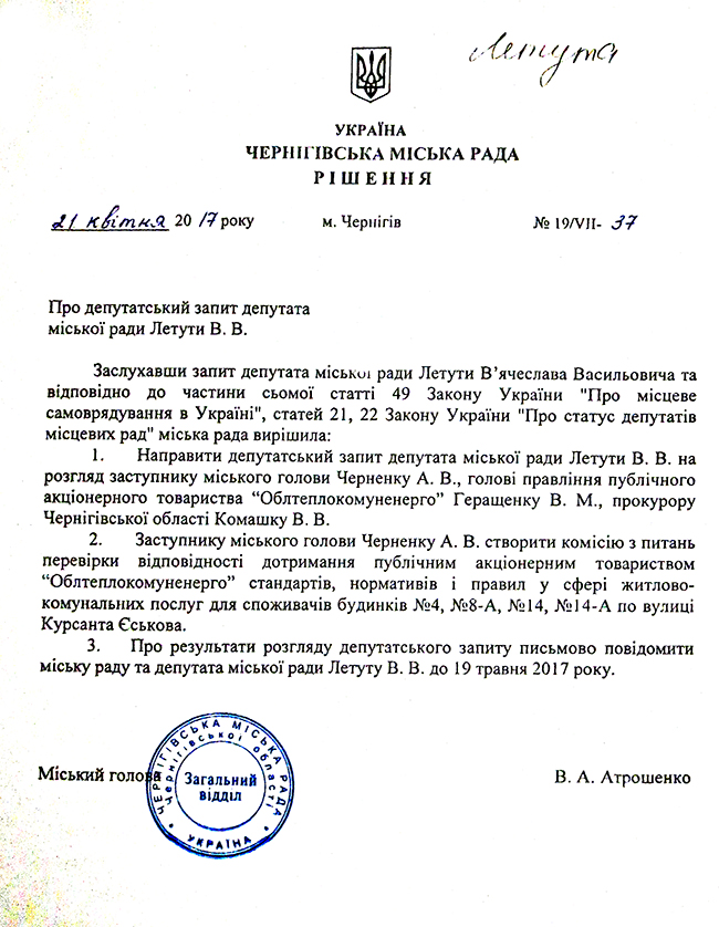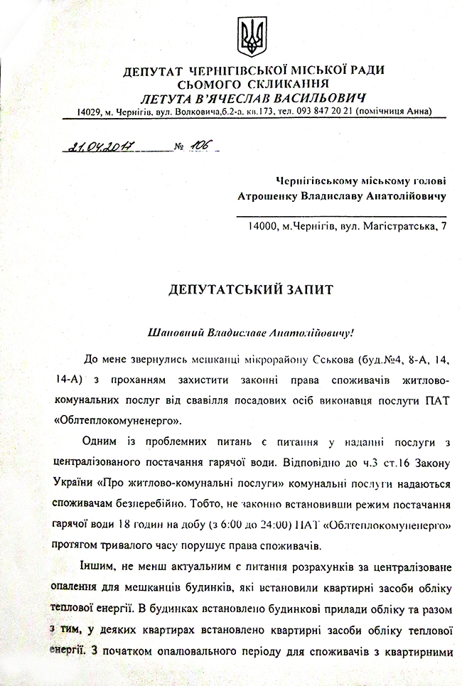 В конце апреля 2017 года с депутатским запросом обратился Вячеслав Летута. Темой запроса стала проблема с начислениями за отопление мест общего пользования. Запрос был составлен на основании обращений жильцов многоквартирных домов по улице Курсанта Еськова. Но, интересно то, что вместо главной проблемы жителей Чернигова, в квартирах которых установлены счетчики тепла, первым (а значит и ключевым) пунктом стал вопрос отсутствия горячей воды в домах в ночное время!