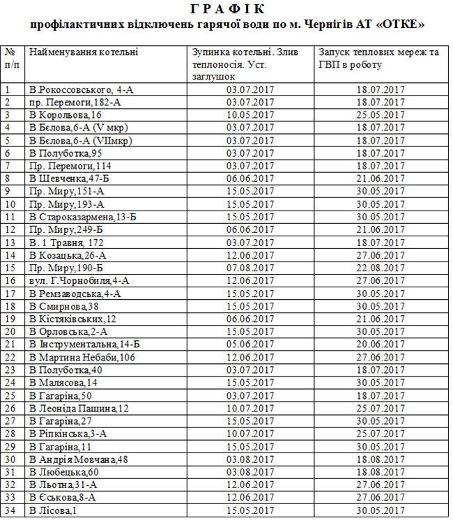 Отметим, что в районе улиц Гетмана Полуботка – Рокоссовского за горячее водоснабжение отвечает ПАО «Облтеплокоммунэнерго». Но, в летний период в дома с горячим водоснабжением теплую воду сюда поставляет КЭП Черниговская ТЭЦ ООО «Фирма «ТехНова». Поэтому в дни, когда на ТЭЦ полностью отключают горячую воду, ее нет и в домах ОТКЭ.