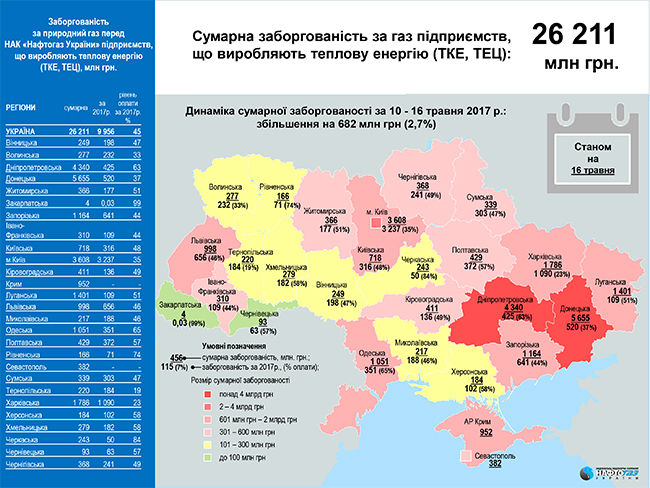 Сказать, что сегодня долгов нет – нельзя. Более того, судя про информации Нефтегаза, долги теплогенерирующих компаний накапливаются. По информации, опубликованной 17 мая 2017 года, задолженность теплогенерирующих предприятий Черниговской области составляет более 368 млн. грн. При этом задолженность за 2017 год – более 240 млн. грн. Уровень оплат за газ – 49%