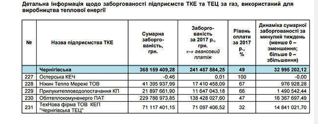 Если брать по городу Чернигову, то наибольшим должником является «Облтеплокоммунэнерго» – 230 млн. грн. При этом задолженность за 2017 год – 138 млн. грн. Уровень оплат в текущем году составил 47%.
