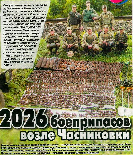 Вот уже который день возле села Часниковка Бахмачского района, а точнее — на 14-м километре перегона Часниковка — Дочь Юго-Западной железной дороги, возле одноименной станции находят снаряды и мины. Это группа разминирования 8-го Черниговского учебного центра Государственной специальной службы транспорта Министерства инфраструктуры обследует и очищает полосу отвода железнодорожного пути от взрывоопасных предметов времен Второй мировой войны.