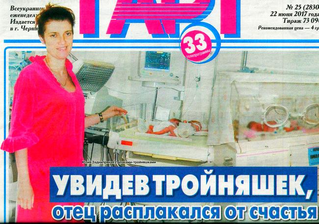- Ничто не предвещало, что я должна родить тройню. Ни у меня, ни у мужа в роду не было даже двойняшек, - рассказывает Юлия. - Сначала УЗИ показывало двойню — мы с мужем хоть и удивились, но очень обрадовались. И только во время третьего исследования я услышала: «У вас тройня!» У меня был шок, сначала очень испугалась. Тут же позвонила мужу, но он меня успокоил: мол, какая разница, сколько у нас родится детей? Все наши, будем растить. Он это известие принял спокойно. Мы поженились всего год назад и очень хотели общего ребенка. У нас от предыдущих браков есть по сыну (моему Вадиму - 12, а сыну мужа Диме, который живет со своей мамой, 13 лет), поэтому муж мечтал о дочке. А родилось сразу трое! Практически всю беременность я провела в Бахмачской районной больнице. Большое спасибо моему врачу Константину Смолинскому - не знаю, как бы я выносила малышей без него. По словам врачей, моя тройня — первая в Бахмаче за последние 20 лет! Также благодарю весь персонал Черниговского роддома! Кстати, за все время, что я здесь, не заплатила ни копейки.