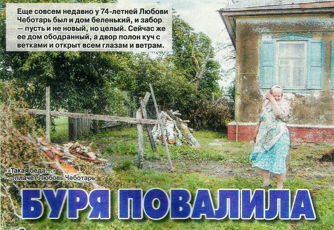 - У нас здесь выгон, так с его стороны ветер и град устремились в нашу сторону. Сначала поднялся ветер, потом пошел дождь, а затем град как припустил! Я была на кухне, слышу: и трещит, и завывает. А потом ка-а-а-к бухнет! Захожу в комнату дочки — о божечки! Стекол в окнах нет, и с улицы... торчат ветки березы. Она упала на дом! А была же высоченная и толстая, росла под двором еще и до меня (я в этом доме живу 13 лет), такой беды натворила!..