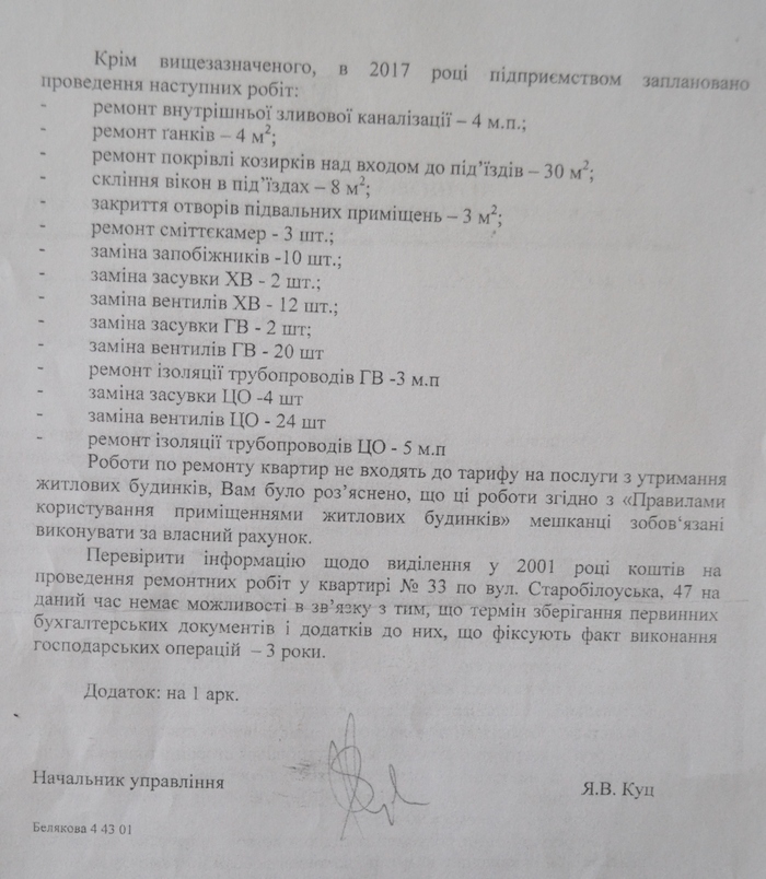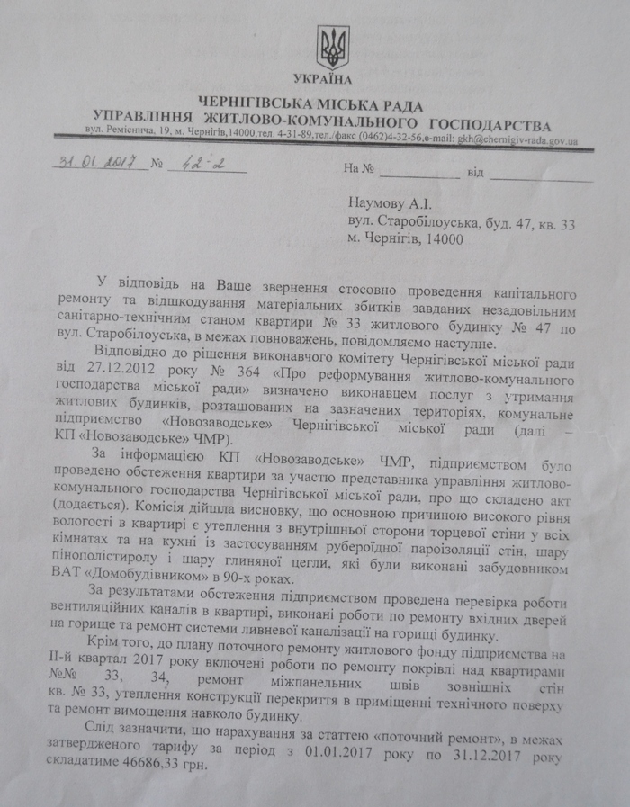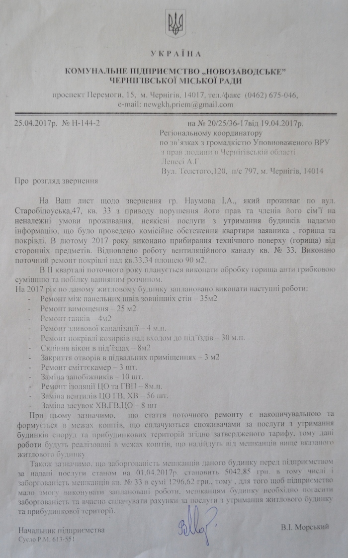 Ниже приводим ответы Управления ЖКХ, которые пришли Наумовым и уполномоченной по правам человека в Черниговской области Алле Лепехе, к которой обратился Андрей.
