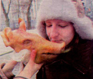 Распаковали несколько сосисок разного сорта, накрыли газеткой, чтоб подопытные не видели. Для сравнения в эксперименте участвовал кусок копченой свиной головы. Купили на Центральном рынке в молочном павильоне по 13,50 гривны за килограмм.