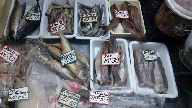 В отдельных магазинчиках продается курятина и свежемороженая и соленая рыба.