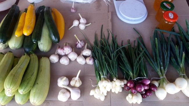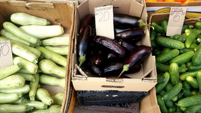 Из овощей в павильонах в продаже по-настоящему вкусные ароматные мясистые розовые и желтые, красные помидоры от 22 до 28 гривен, огурчики по 15 гривен, херсонские баклажаны по 20 гривен и кабачки от 5 гривен за килограмм. Также, жители города на рынке продают свежую зелень с огорода, зеленый лук, молодой чеснок и картофель, свеклу и кабачки. Еще не созрел сочный болгарский перец, но в продаже появился херсонский светло-желтый тонкошкурый по 17 грн./кг.