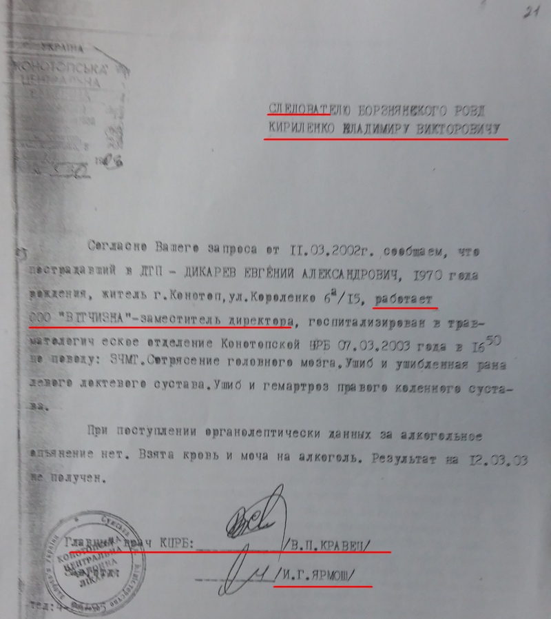 11.03.2003 за подписью главврача В.П.Кравца и второго врача И.Г.Ярмоша, следователю пришел ответ, что Дикарев поступил к ним 7 марта 2003 года, в 16.50 с ЗЧМТ, ушибом левого локтевого сустава и ушибом и гемартрозом (гемартроз, это медицинский термин, который обозначает синяк – прим.авт.) правого коленного сустава и что он является сотрудником ООО «Отчизна».