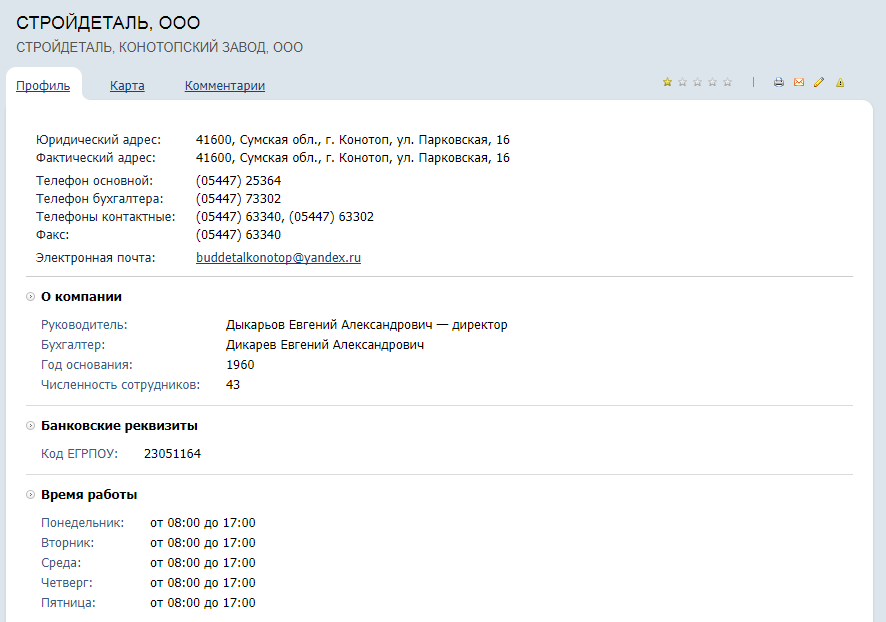 Завод находится в г. Конотоп, ул. Парковская, 16, на нем работает 45 человек. По одному из номеров телефонов (05447) 6-33-40, которые были перечислены, как контактные, взяла трубку женщина (не представилась). Она подтвердила, что Дикарев является директором завода, что он живет в Конотопе и часто бывает на предприятии. Когда она услышала о чем речь и нашу просьбу о том, чтобы можно было поговорить с Евгением Александровичем, то заявила, что не собирается ему ничего передавать и бросила трубку. Также она сказала, что Дикарев когда-то работал в ООО «Отчизна», но детали этого периода его жизни ей неизвестны. Также по нашей информации известно, что семья Евгения Дикарева живет в Германии.