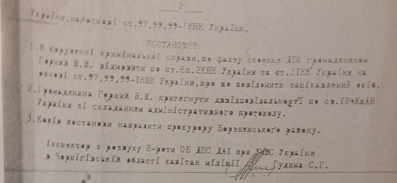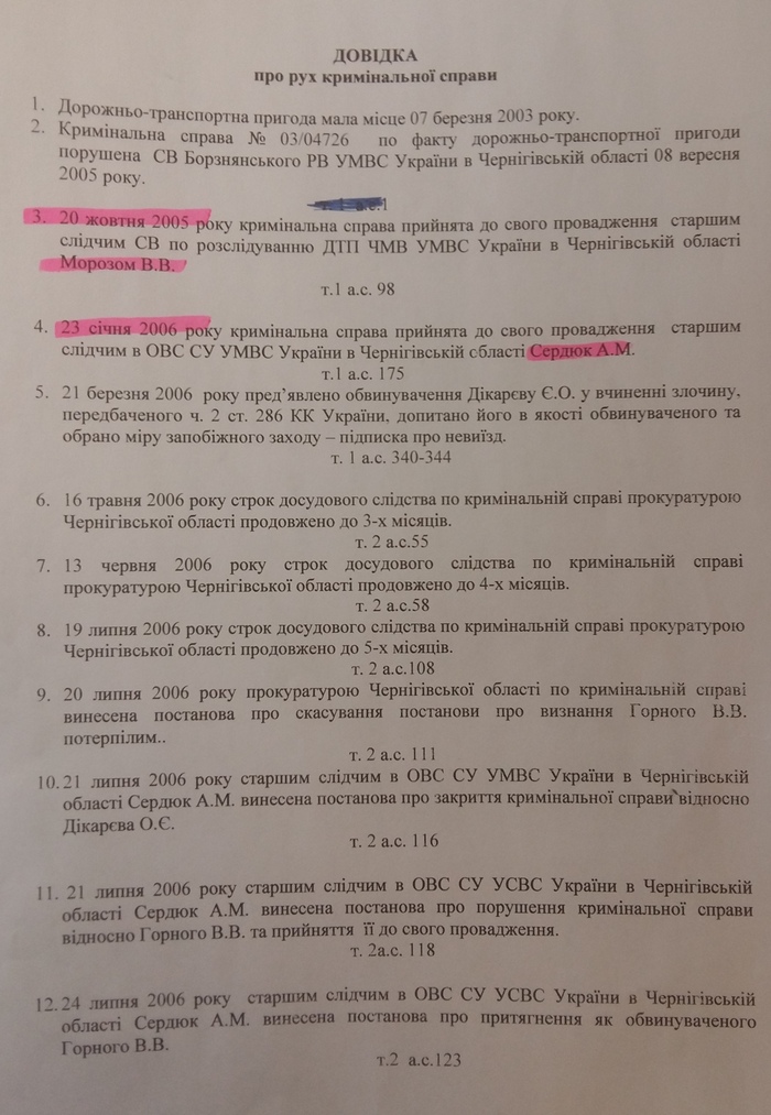 - После первого визита к Луценко, я вновь пришел к Костюку. Попросил, чтобы расследование перенесли из Борзны в Чернигов. Перенесли и передали в производство старшему следователю СО по расследованию ДТП ЧГО УМВД Морозу В.В. Я за свои деньги, - на то время это стоило 250 грн. делал экспертизу. Но дело стояло на месте, открыли да и открыли, никто дальше ничего не собирался делать. После повторных визитов к Министру Луценко в октябре 2005-го и январе 2006-го., 23.01.2006 уголовное дело принял в производство старший следователь ОВД СУ УМВД Сердюк А.М.