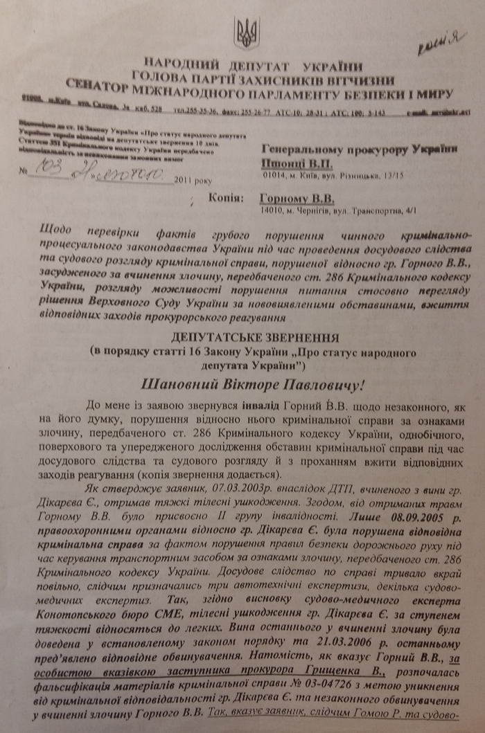 Депутатское обращение от Юрия Карамзина Генпрокурору Пшонке в поддержку Виталия Горного