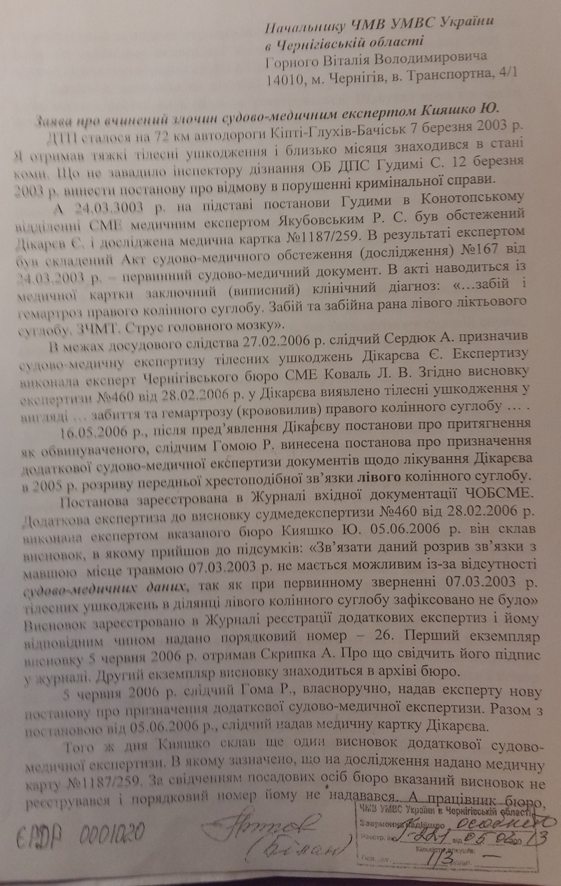 В тоже время, согласно его показаний, которые он давал в октябре 2008 года помощнику прокурора г.Чернигова Хамайко С.В. (на сегодняшний день Хамайко – заместитель руководителя Менской местной прокуратуры – прим.авт.), Юрий Кияшко на занимаемой им должности к 2008-му году проработал 10 лет, всего стаж работы - 15 лет. 27.02.2006 старшим следователем Сердюком, в рамках криминального дела №03/04726 была назначена экспертиза телесных повреждений Дикарева Е.А. Экспертизу провела эксперт Коваль Л.В., на основании данных из оригиналов медицинских документов, предоставленных Конотопской ЦРБ, от 12.03.2003 и акта Конотопского райотдела СМЕ от 24.03.2006 года. В дальнейшем старший следователь Гома Р.А. в рамках данного уголовного дела назначил дополнительную судебно-медицинскую экспертизу телесных повреждений Дикарева Е.А.