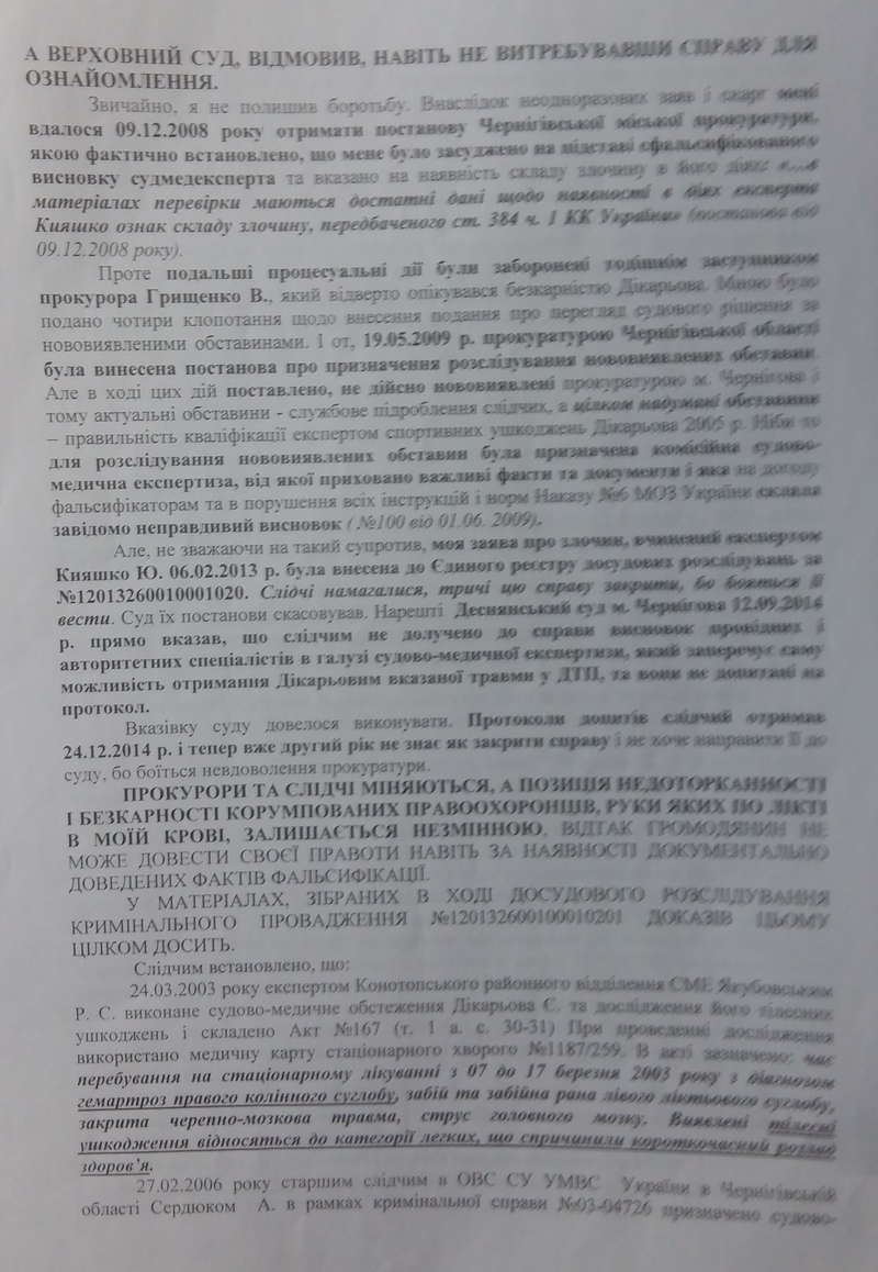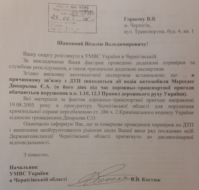 Лишь в августе 2005-го мужчине улыбнулась удача, - он попал на запись телепередачи «Скарги громадян на дії міліцї». После чего в письме №8/5-Г-186 от 29.082005 начальник УМВД Украины в Черниговской области Василий Васильевич Костюк написал: «… в причинной связи с ДТП находятся действия автомобиля Мерседес Дикарева Е.А. (в его действиях во время ДТП усматриваются нарушения п.п.1.10, 12.3 ПДД Украины). Все материалы по факту ДТП направлены 19.08.2005 в прокуратуру Черниговской области для возбуждения уголовного дела, предусмотренного ст.286 КК Украины, относительно гражданина Дикарева Е.А.»