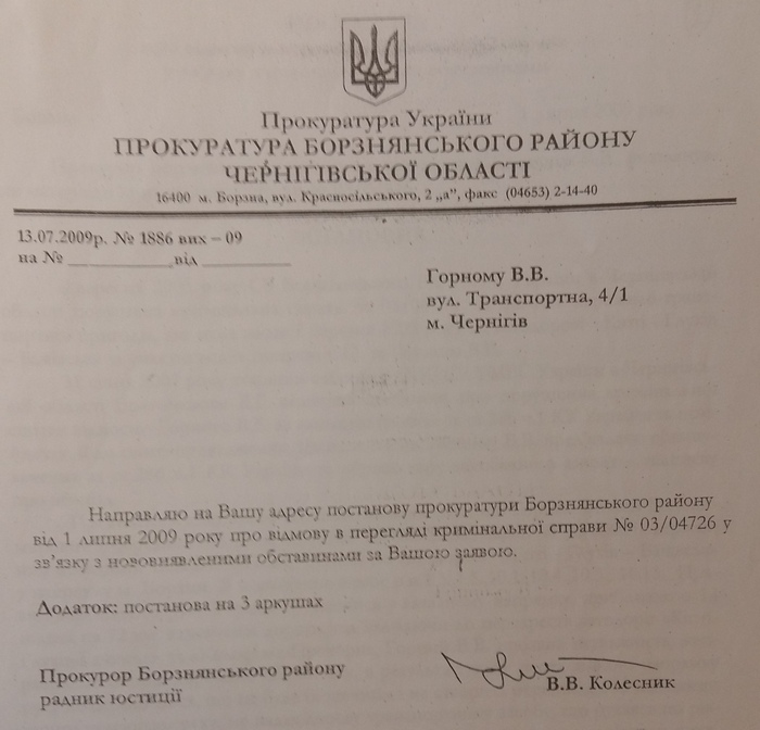 8.05.2007 направил дело №03/04726 в двух томах (1-й на 364 стр., 2-й – на 322 стр.) прокурору Борзнянского района Луговому О.Е – тогдашний начальник следственного управления УМВД Украины в Черниговской области – полковник милиции Товкало М.В., 1964 г.р.