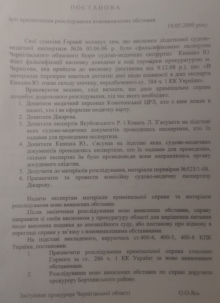 20.07.2006 прокуратурой Черниговской области выносится постановление о том, чтобы отменить постановление по признанию Виталия Горного потерпевшим.
