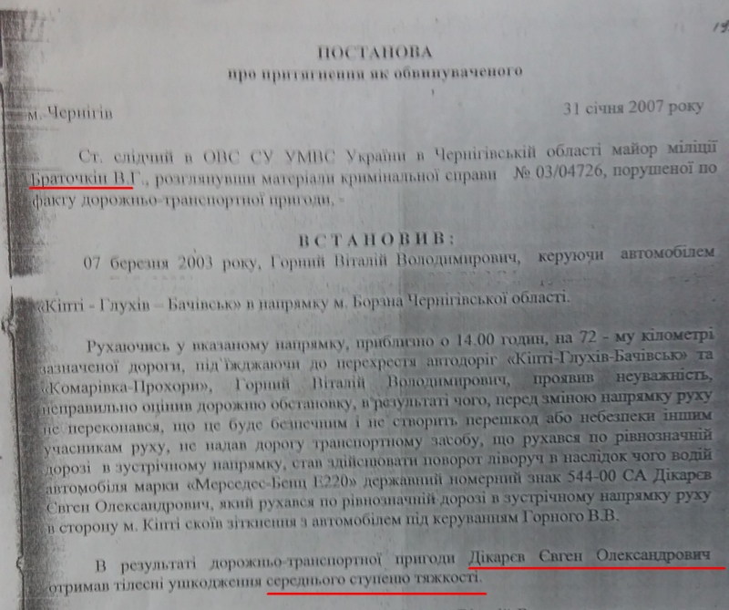 30 ноября 2006-го года дело передают старшему следователю ОВД СУ УМВД Виталию Григорьевичу Браточкину. 31.01.2007 Браточкин предъявляет Горному обвинение в совершении преступления, допрашивает его и берет подписку о невыезде. Браточкин возвращает Горному его порванную дубленку с места ДТП и накладывает арест на 1/3 его дома на улице Транспортная, 4, а прокурор Борзнянского района направляет иск по возмещению убытков за лечение миллионера Дикарева в Коропской ЦРЛ (той самой, где была запрошена информация о месте работы Дикарева) на сумму 182.32 грн.