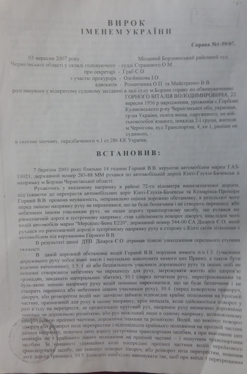 После выписки Виталий Владимирович узнал, что оказывается, согласно постановления следователя, он формально виноват в аварии, но в виду того, что участники ДТП претензий друг к другу не имеют – решено не заводить дело. Так, 12 марта 2003-го года инспектор дознания 2 роты ОБ ДПС (отдельный батальон дорожно-патрульной службы) ГАИ при УМВД Украины Гудима С.Г. вынес постановление об отказе, о возбуждении уголовного дела. А на схеме ДТП, которую оформили ГАИшники было указано, что Горный осуществляя маневр поворота налево, находясь на равнозначной дороге, не предоставил право проезда автомобилю, что ехал по этой же полосе во встречном направлении.