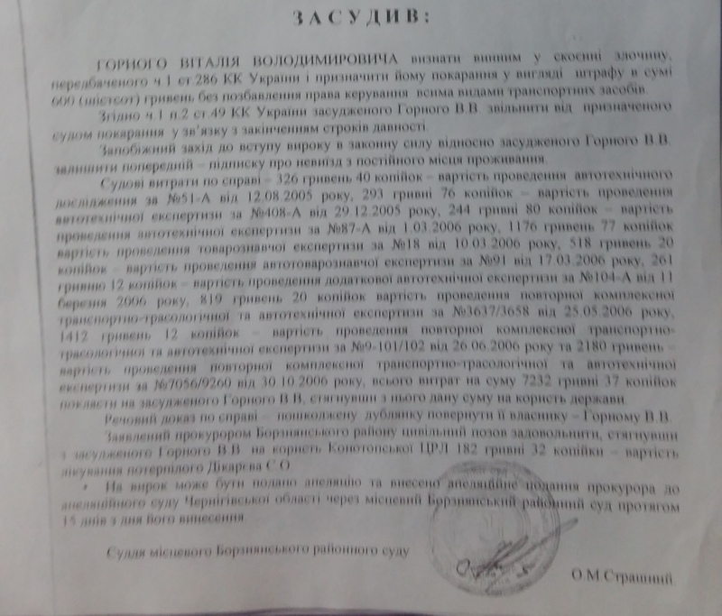 Судья Страшный 3 сентября 2007 года присудил Виталию Горному выплатить штраф в сумме 600 гривен, оплатить судебные затраты по делу, а именно: