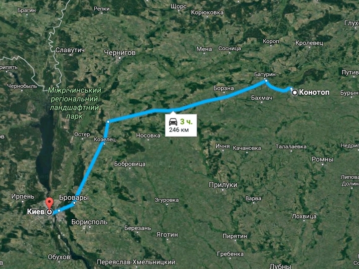 Маршрут следования Евгения Дикарева, 7 марта 2003 года: Конотоп-Киев