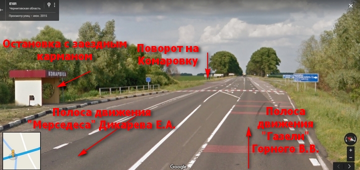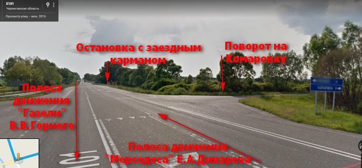 На 72-м километре дороги «Копти-Глухов-Бачевск», недалеко от поворота на с.Комаровка машина Горного заглохла. Мужчина, недолго думая, расположил автомобиль в заездном кармане автобусной остановки, который находится на расстоянии 3.40 м. от проезжей части и начал разбираться с неисправностью. В это время, во встречном направлении (в сторону Киева) мчался на скорости 150-180 км.в час (по данным одной из проведенных экспертиз) автомобиль марки «Мерседес-Бенц Е220» с номерами 544-00 СА. За рулем Мерседеса пребывал Дикарев Евгений Александрович, 1970 г.р., его пассажиром был - Сологуб Юрий Григорьевич, 1971 г.р., оба – жители г.Конотоп Сумской области.