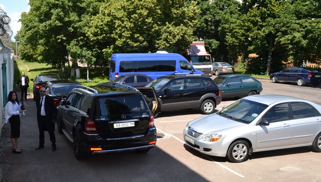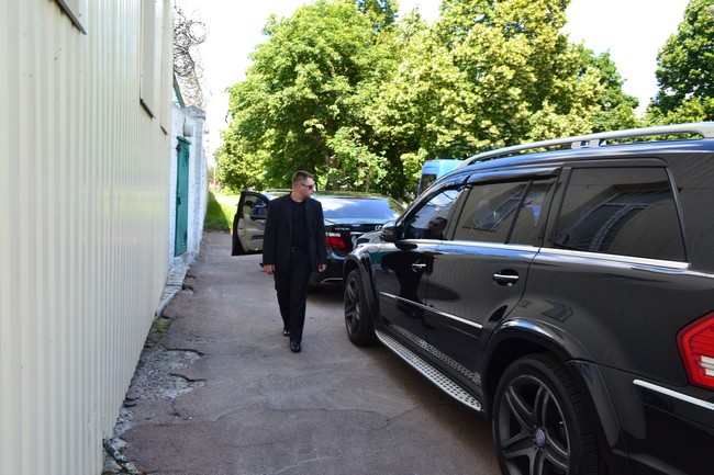 Гости прибыли кортежем, в который входили: 2 микроавтобуса, несколько легковых машин и 2 внедорожника марок Lexus и Mercedes-Benz GL 500 4MATIC, и заняли практически все место на парковке возле колонии.