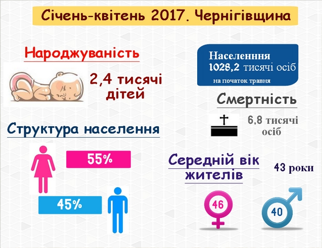 За січень–квітень цього року в області народилося 2,4 тисячі дітей. На кожну тисячу жителів – 7,1 новонароджених. За цей же період померло 6,8 тисячі осіб, або 20 осіб у розрахунку на тисячу наявного населення.