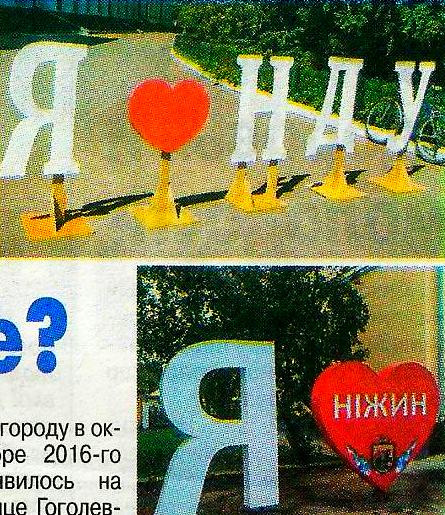 В Нежине одно признание в любви родному городу в октябре 2016-го появилось на улице Гоголевской по инициативе местного народного депутата. Но впоследствии букву «Я» и сердце с надписью «Нежин» убрали, так как их кто-то изувечил. В том же месяце надпись «Я люблю НДУ» изготовили студенты гоголевского вуза.
