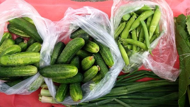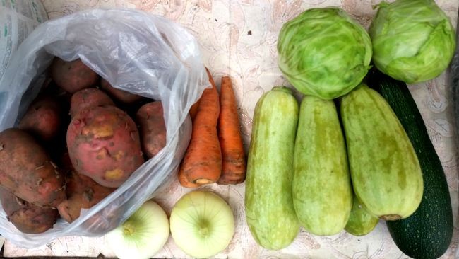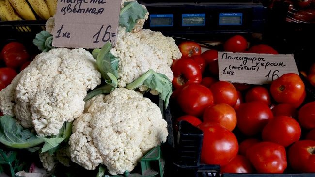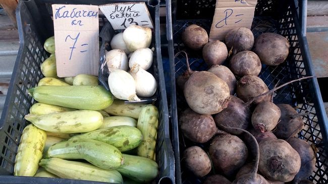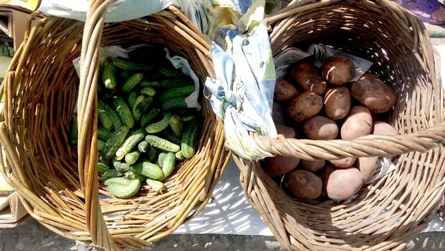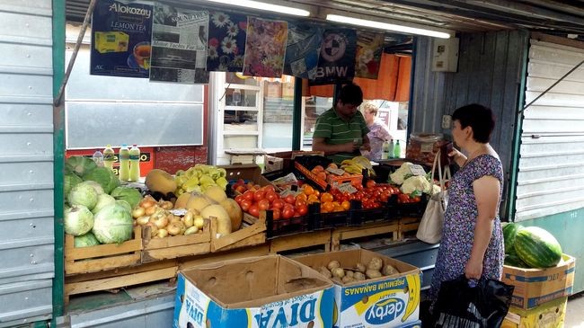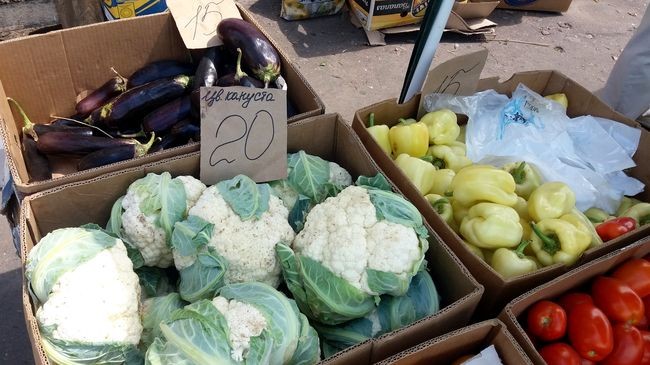 Теперь об овощах. В большом ассортименте помидоры. Разные сорта, размер, цвет, вкус. Цена – от 13 до 27 гривен за кг. Созрели и приобрели вкус и аромат хрустящие украинские огурчики. Молодой картофель стал твердым и по-настоящему вкусным по сравнению с тем, который привозили из Херсонской области в июне. Все овощи молоденькие, свежие.