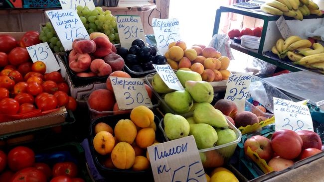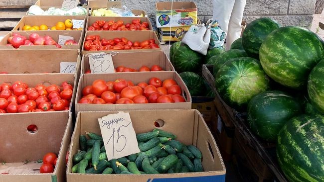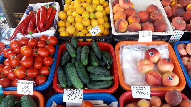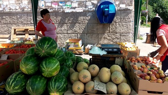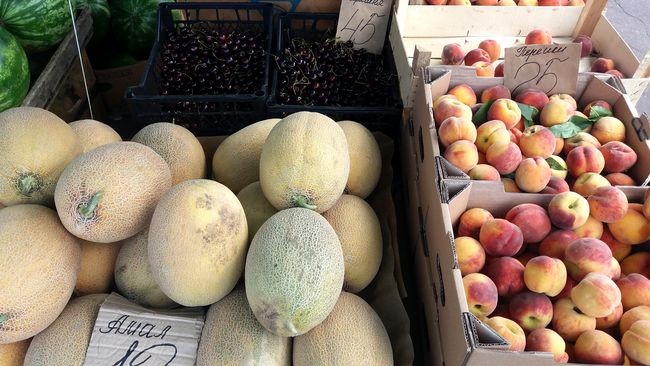 На дворе - последняя неделя июля. Поэтому, на фруктово-овощных раскладках – дары природы на любой вкус из южных регионов Украины, в основном из Херсонской и Одесской областей. Созрели уже дыни, арбузы, виноград. В большом ассортименте персики. Цены в зависимости от сорта, размера – от 23 до 37 гривен за килограмм. Нет в продаже импортных экзотических авокадо, киви, грейпфрутов. Из цитрусовых – только турецкие лимоны.