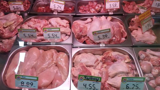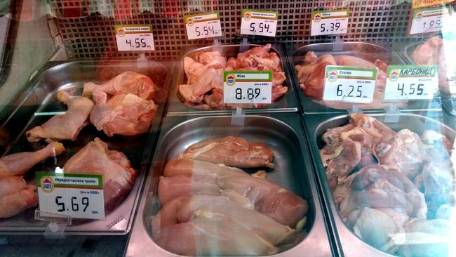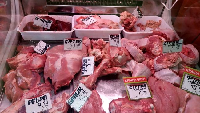 Надо заметить, что цены на свиное мясо здесь на кое-какие части туши меньше на 5-10 гривен, чем на других рынках города. И к 11-12 часам, как правило, его распродают. Например, ошеек продают по 122 гривны (на других рынках 135 гривен), стегно – по 107 гривен за кг (на других – 115 грн.), грудинка - по 60 грн./кг (на других рынках – 80). В тоже время, на подчеревок и боковину цена выросла на 5 гривен. В павильонах есть в продаже куриное мясо, а в одном из них – свиное и индюшиное.