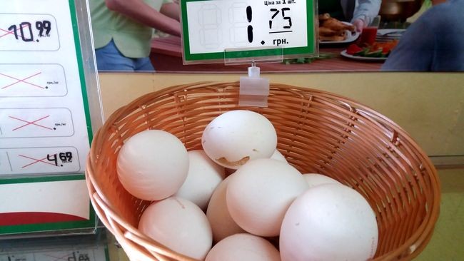 Куриные яйца здесь в павильонах продают по цене 14 и 17.50 за десяток.