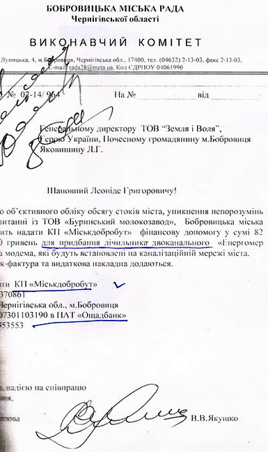 Стали відомі нові факти з історії придбання лічильника каналізаційних стоків в Бобровиці за матеріальну допомогу товариства «Земля і воля», в ході чого третина суми наданої допомоги була переведена в готівку – 26600гривень. Для чого це робилося – відомо лише організаторам цієї фінансової схеми. Зараз ними займається поліція.
