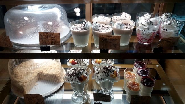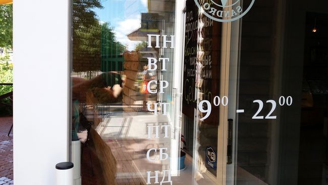 На стене вывешены названия напитков и цены, полочки с бумажными стаканчиками и коробками для кондитерских изделий на вынос. То есть, в кафе предоставляется услуга «Takeaway», о чем также говорит вывешенная табличка на летней террасе.