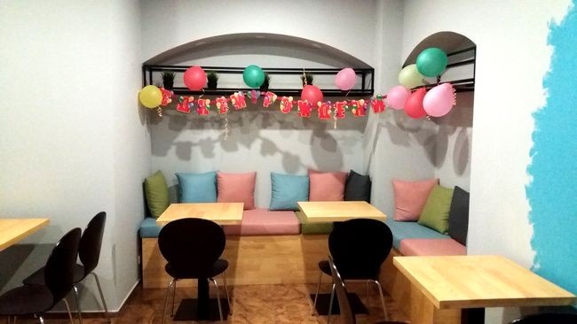 В маленьком банкетном зале кафе можно устраивать встречи с близкими друзьями, семинары, тематические вечера, хорошо отмечать детские праздники. Рядом с этим залом предусмотрительно подвешена доска с ведерками для мела, на которой детки могут рисовать во время отдыха, а у самого входа – детский стульчик для совсем маленьких.